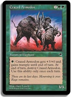 <G>: Crazed Armodon gets +3/+0 and gains trample until end of turn. At end of turn, destroy Crazed Armodon. Use this ability only once each turn.