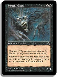 Shadow. Whenever any creature with shadow is put into any graveyard from play, put a +1/+1 counter on Dauthi Ghoul.