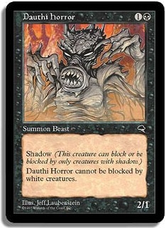 Shadow. Dauthi Horror cannot be blocked by white creatures.