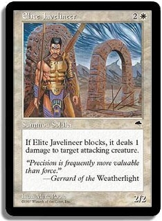 If Elite Javelineer blocks, it deals 1 damage to target attacking creature.