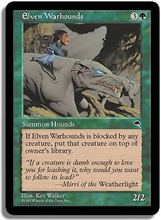 If Elven Warhounds is blocked by any creature, put that creature on top of owner's library.