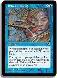 When target spell is successfully cast, put X delay counters on it. X cannot be 0. During each upkeep of that spell's caster, remove a delay counter from the spell. If the spell has no delay counter on it, it resolves.