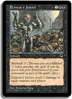 Buyback <3>. Evincar's Justice deals 2 damage to each creature and player.