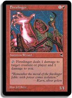 <T>: Fireslinger deals 1 damage to target creature or player and 1 damage to you.