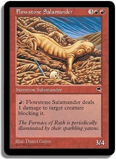 <R>: Flowstone Salamander deals 1 damage to target creature blocking it.