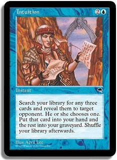 Search your library for any three cards and reveal them to target opponent. He or she chooses one. Put that card into your hand and the rest into your graveyard. Shuffle your library afterwards.