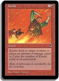 Kindle deals to target creature or player an amount of damage equal to 2 plus the number of Kindle cards in all graveyards.