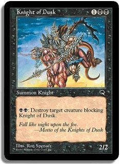 <BB>: Destroy target creature blocking Knight of Dusk.