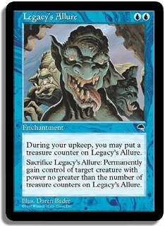 During your upkeep, you may put a treasure counter on Legacy's Allure. <Sacrifice Legacy's Allure>: Permanently gain control of target creature with power no greater than the number of treasure counters on Legacy's Allure.