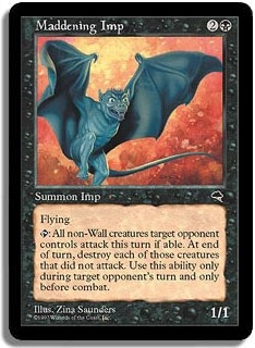 Flying. <T>: All non-Wall creatures target opponent controls attack this turn if able. At end of turn, destroy each of those creatures that did not attack. Use this ability only during target opponent's turn and only before combat.