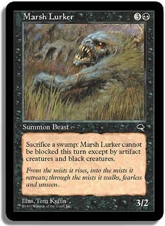 <Sacrifice a swamp>: Marsh Lurker cannot be blocked this turn exept by artifact creatures and black creatures.