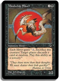 Each Sliver gains "<2,Sacrifice this creature>: Target player discards a card at random. Play this ability as a sorcery."