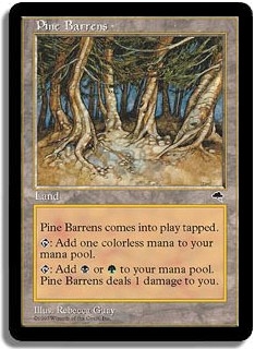 Pine Barrens comes into play tapped. <T>: Add one colorless mana to your mana pool. <T>: Add <B> or <G> to your mana pool. Pine Barrens deals 1 damage to you.