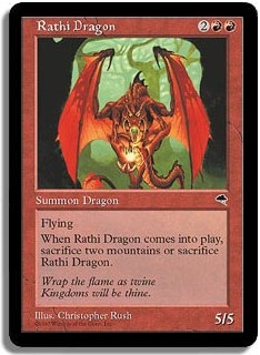 Flying. When Rathi Dragon comes into play, sacrifice two mountains or bury Rathi Dragon.