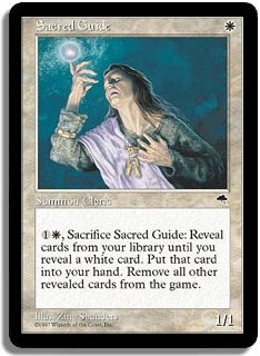 <1W,Sacrifice Sacred Guide>: Reveal cards from your library until you reveal a white card. Put that card into your hand. Remove all other revealed cards from the game.