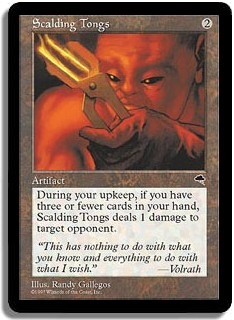 During your upkeep, if you have three or fewer cards in hand, Scalding Tongs deals 1 damage to target opponent.