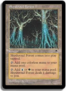 Skyshroud Forest comes into play tapped. <T>: Add one colorless mana to your mana pool. <T>: Add <U> or <G> to your mana pool. Skyshroud Forest deals 1 damage to you.