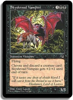Flying. <Choose and discard a creature card>: Skyshroud Vampire gets +2/+2 until end of turn.