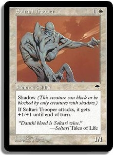 Shadow. If Soltari Trooper atacks, it gets +1/+1 until end of turn.