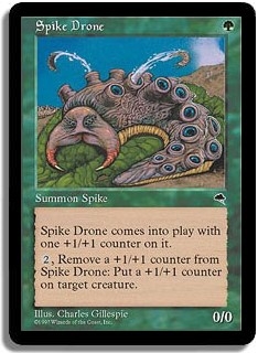 Spike Drone comes into play with one +1/+1 counter on it. <2,Remove a +1/+1 counter from Spike Drone>: Put a +1/+1 counter on target creature.