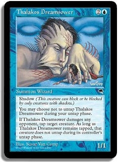 Shadow. You may choose not to untap Thalakos Dreamsower during your untap phase. If Thalakos Dreamsower damages any opponent, tap target creature. As long as Thalakos Dreamsower remains tapped, that creature does not untap during its controller's untap phase.