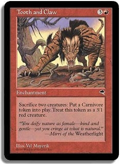 <Sacrifice two creatures>: Put a Carnivore token into play. Treat this token as a 3/1 red creature.