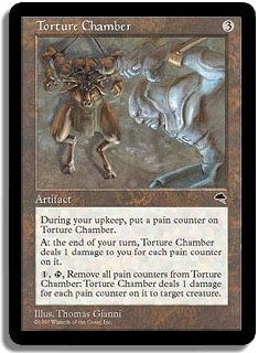 During your upkeep, put a pain counter on Torture Chamber. At the end of your turn, Torture Chamber deals 1 damage to you for each pain counter on it. <1,T,Remove all pain counters from Torture Chamber>: Torture Chamber deals 1 damage for each pain counter on it to target creature.