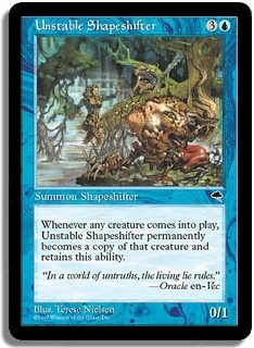 Whenever any creature comes into play, Unstable Shapeshifter permanently becomes a copy of that creature and retains this ability.