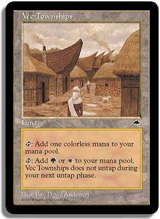 <T>: Add one colorless mana to your mana pool. <T>: Add <G> or <W> to your mana pool. Vec Townships does not untap during your next untap phase.