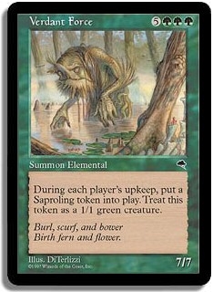 During each player's upkeep, put a Saproling token into play. Treat this token as a 1/1 green creature.