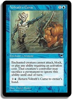 Enchanted creature cannot attack, block or play any ability requiring an activation cost. That creature's controller may sacrifice a permanent to ignore this ability until end of turn. <1U>: Return Volrath's Curse to owner's hand.