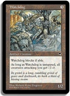 Watchdog blocks if able. As long as Watchdog is untapped, all creatures attacking you get -1/-0.