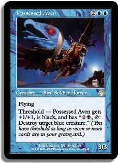 Threshold - Possessed Aven gets +1/+1, is black, and has "T: Destroy target blue creature."