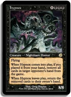 When Hypnox comes into play, if you played it from your hand, remove all cards in target opponent's hand from the game. When Hypnox leaves play, return the removed cards to their owner's hand