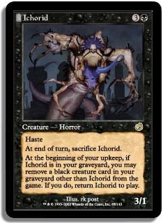 At the beginning of your upkeep, you may remove a black creature card in your graveyard other than Ichorid from the game. If you do, return Ichorid to play.