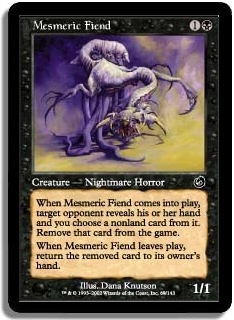 When Mesmeric Fiend comes into play, target opponent reveals his or her hand and you choose a nonland card from it. Remove that card from the game. When Mesmeric Fiend leaves play, return the removed card to its owner`s hand.