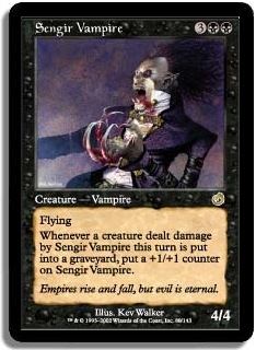 Whenever a creature dealt damage by Sengir Vampire this turn is put into a graveyard, put a +1/+1 counter on Sengir Vampire.