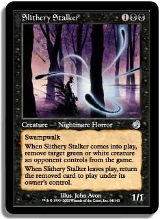 When Slithery Stalker comes into play, remove target green or white creature an opponent controls from the game.