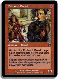 R, Sacrifice Enslaved Dwarf: Target black creature gets +1/+0 and gains first strike until end of turn.