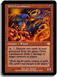 R,T, Remove two cards in your graveyard from the game: Grim Lavamancer deals 2 damage to target creature or player.