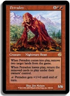 When Petradon comes into play, remove two target lands from the game. When Petradon leaves play, return the removed cards to play under their owners%92 control.