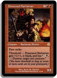 Threshold: Possessed Barbarian becomes black, gains +1/+1, and gains "2B, T: Destroy target red creature."