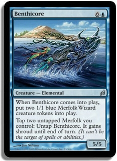 When Benthicore comes into play, put two 1/1 blue Merfolk Wizard creature tokens into play. Tap two untapped Merfolk you control: Untap Benthicore. It gains shroud until end of turn. (It can't be the target of spells or abilities.)