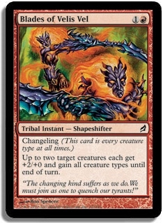 Changeling (This card is every creature type at all times.) Up to two target creatures each get +2/+0 and gain all creature types until end of turn.