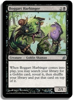 When Boggart Harbinger comes into play, you may search your library for a Goblin card, reveal it, then shuffle your library and put that card on top of it.