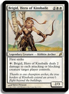 First strike T Brigid, Hero of Kinsbaile deals 2 damage to each attacking or blocking creature target player controls.