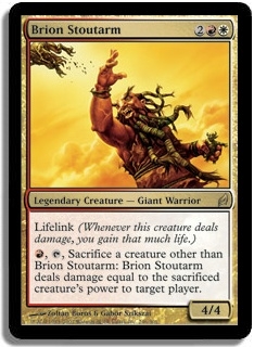 Lifelink (Whenever this creature deals damage, you gain that much life.) R, T, Sacrifice a creature other than Brion Stoutarm: Brion Stoutarm deals damage equal to the sacrificed creature's power to target player.