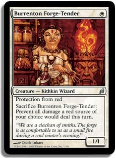 Protection from red Sacrifice Burrenton Forge-Tender: Prevent all damage a red source of your choice would deal this turn.