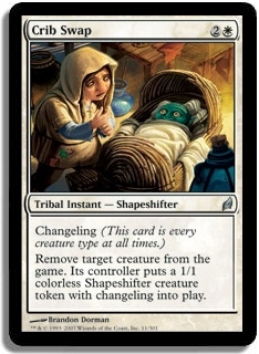 Changeling (This card is every creature type at all times.) Remove target creature from the game. Its controller puts a 1/1 colorless Shapeshifter creature token with changeling into play.