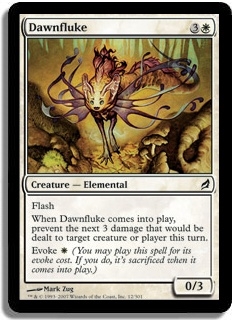 Flash When Dawnfluke comes into play, prevent the next 3 damage that would be dealt to target creature or player this turn. Evoke W (You may play this spell for its evoke cost. If you do, it's sacrificed when it comes into play.)